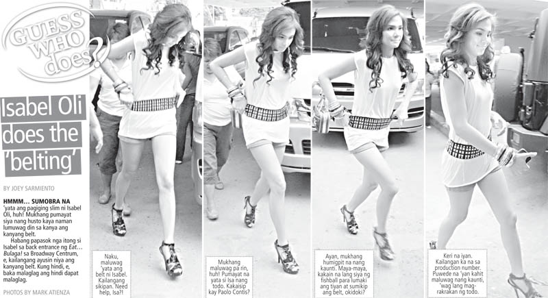 Habang papasok nga ito si Isabel sa back entrance ng Eat… Bulaga! sa Broadway Centrum, e, kailangang ayusin niya ang kanyang belt. Kung hindi, e, baka malaglag ang hindi dapat malaglag.